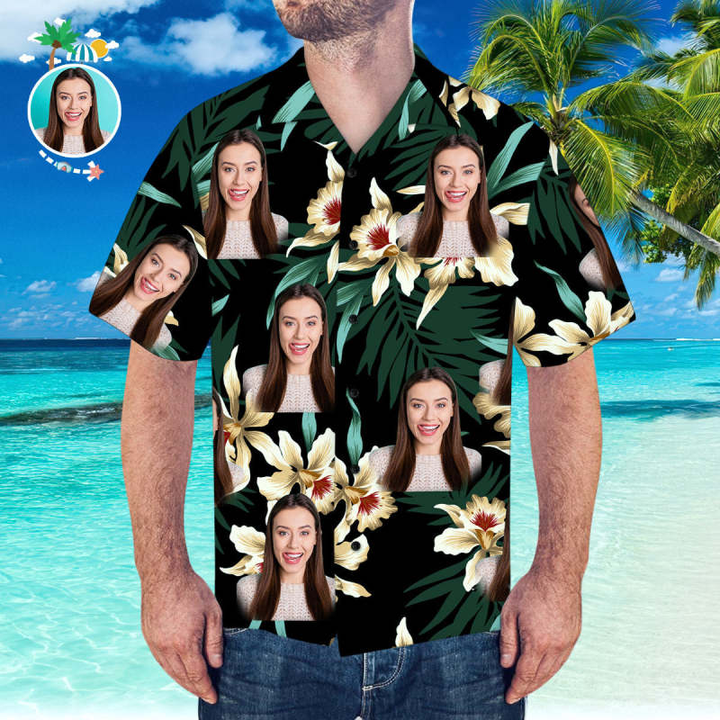 Custom Face Hawaiian Shirt Leaves & Flowers Pattern Hawaiian Shirt for Summer Gift