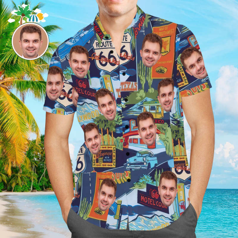 Custom Face Hawaiian Shirt Route 66 Landmarks Aloha Beach Shirt Gift for Him