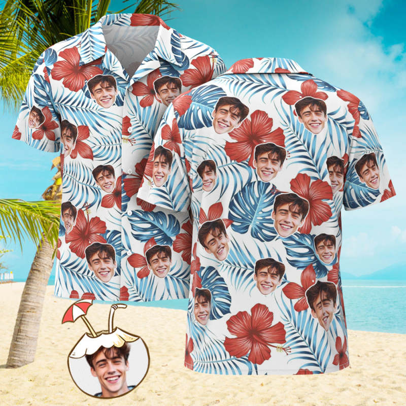 Custom Men's Shirt Face All Over Print Hawaiian Shirt White Hibiscus