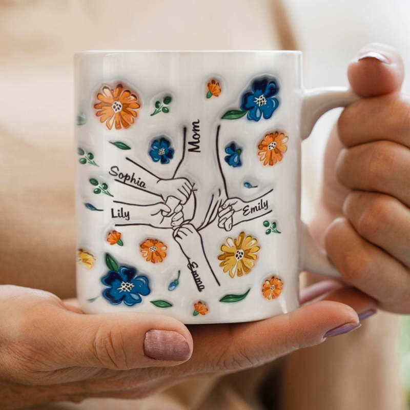 Show your love and appreciation for mom or grandma with a unique design that warms both the hands and the heart. This mug features a touching illustration of holding hands, a heartfelt tribute to the cherished bond between family members.