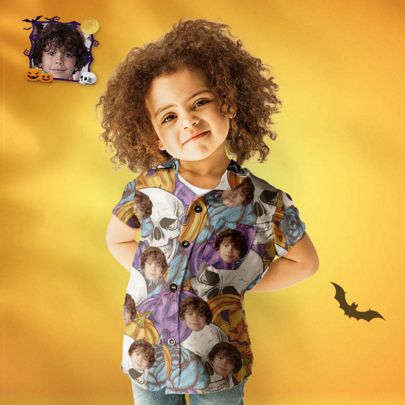 Kid's Custom Face Funny Pumpkin & Skull Print Personalized Halloween Hawaiian Shirt