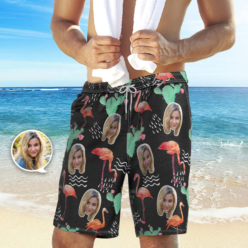 Men's Custom Face Swim Trunks Cactus and Flamingo Personalized Photo Beach Shorts Funny Gift for Him