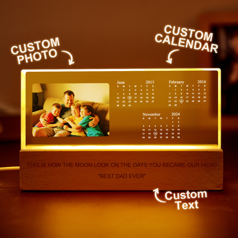 Celebrate unforgettable memories with this Custom Light-Up Calendar Lamp. Engraved with up to 3 custom calendar dates, a cherished photo, and your personalized message, this acrylic night light is a beautiful keepsake for Father’s Day, birthdays, or anniversaries. It’s a heartfelt gift that lights up any room—literally and emotionally.