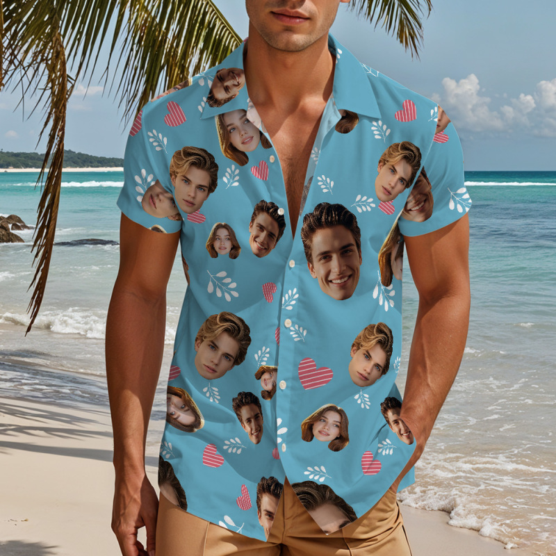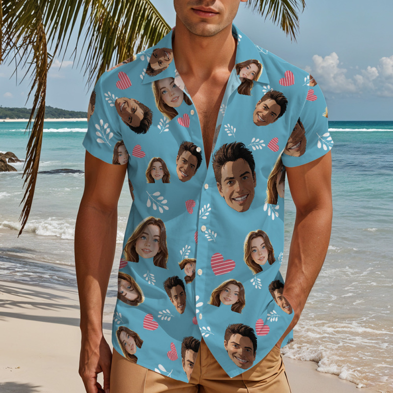 Home / Custom Face "Hearts & Doodles" Sky-Blue Hawaiian Shirt – Fun Personalized Vacation Shirt for Men, Beach Party Wear