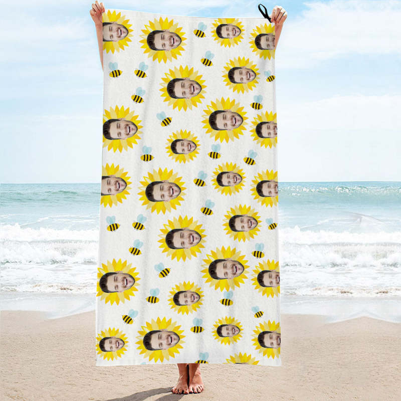 Custom Face White Sunflower Beach Towel Personalized Photo Beach Towel Funny Gift