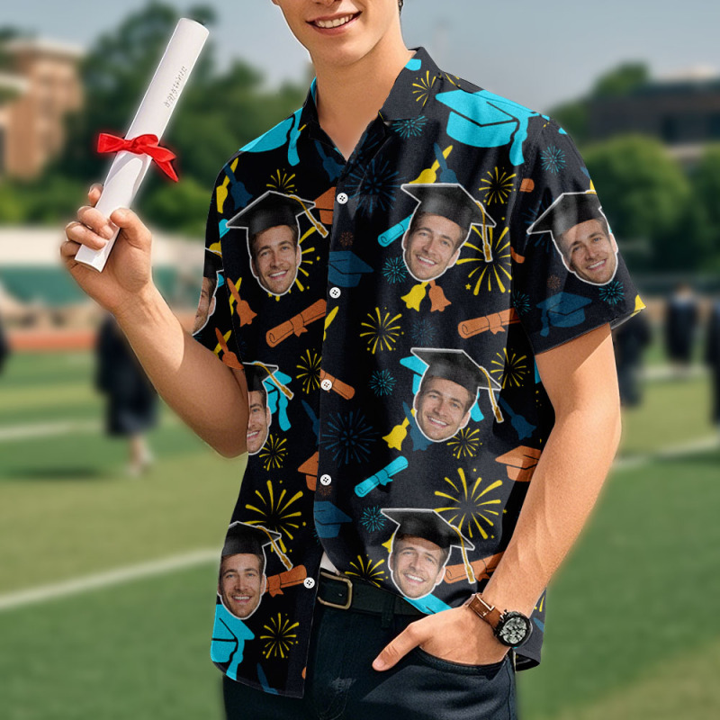 Home / Custom Graduation Hawaiian Shirt Fireworks & Cap Design with Face Photo
