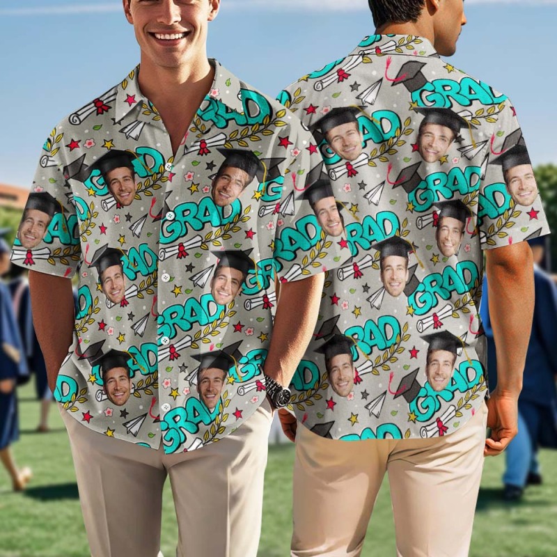 Put your (or their!) face on this hilarious custom Hawaiian shirt and make sure everyone remembers the grad in style. Whether it's for a senior prank, a grad party outfit, or just to show some love – this shirt delivers laughs, looks, and loud vibes.